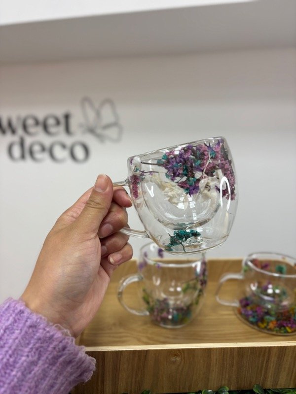 Taza doble vidrio con flores secas.